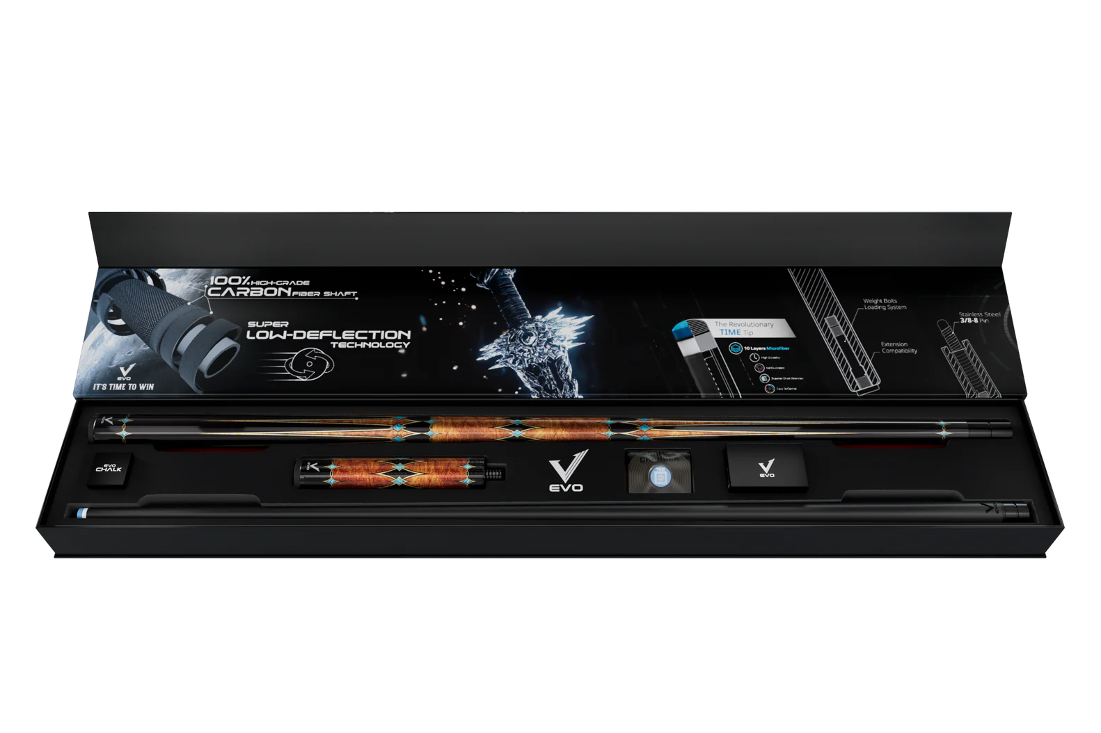 Premium-Queue + 6" Verlängerung + TIME Tip + Handschuh + Kreide. Alles, was Sie für Ihr Spiel brauchen, in einem Paket.