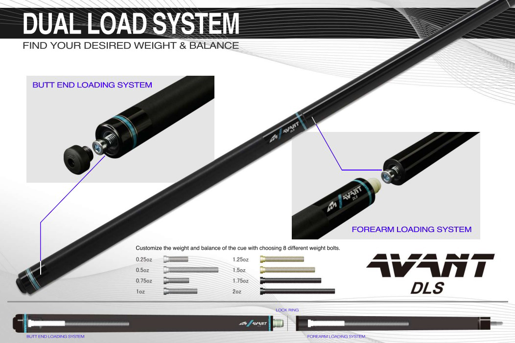 Das revolutionäre AVANT-Queue mit seinem Dual-Loading-System bietet eine beispiellose Menge an Gewichts-Konfigurationen, sodass es ideal ausbalanciert werden kann. Durch 8 verschiedene Schrauben, die in den Butt und Forearm eingesetzt werden können, sind Ihr optimales Gewicht und Gleichgewicht in Schritten von 0,25 oz Unzen justierbar.