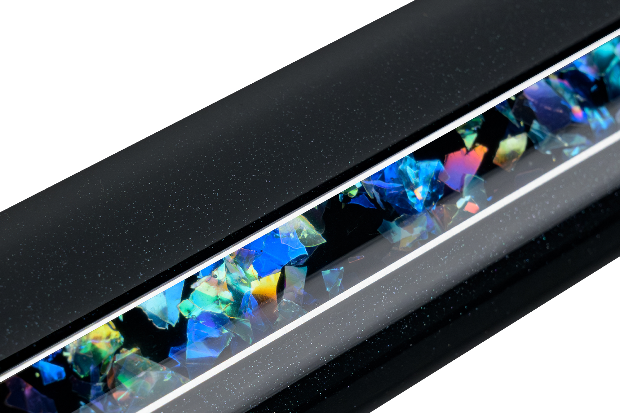 Das P3 Galaxy Queue beeindruckt mit leuchtenden Inlays aus Metall und dimensionalen Composite-Materialien, inspiriert von den Farben des tiefen Weltraums, auf einem glänzenden schwarzen Metallic-Finish.
