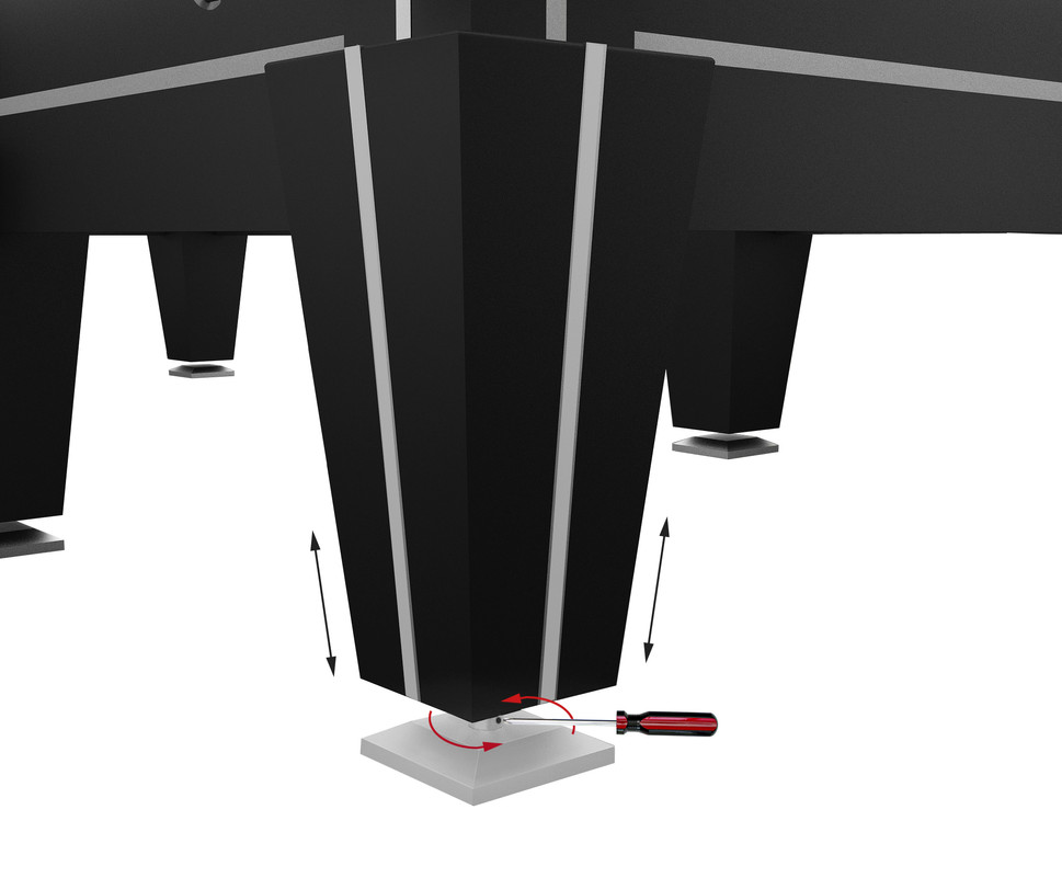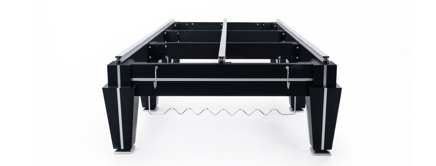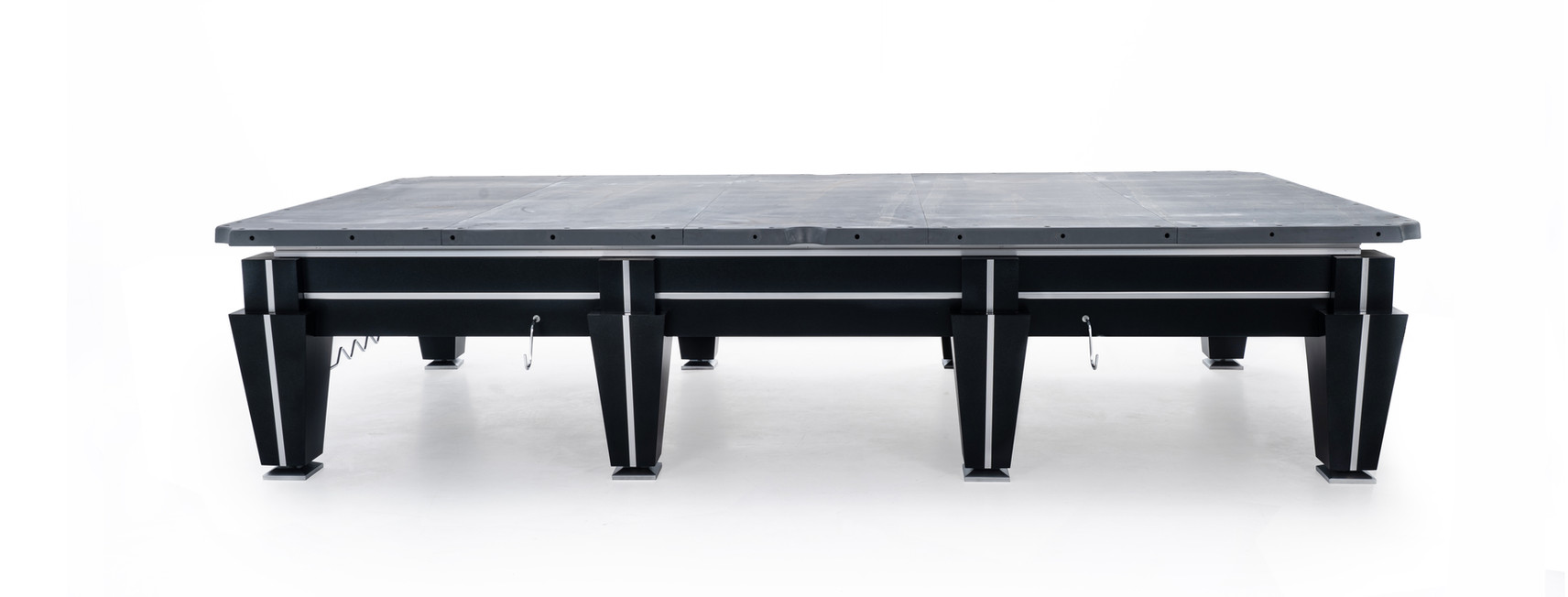 Der Tisch verfügt über fünf präzise zugeschnittene Schieferplatten aus 45 mm starkem Premium-RASSON-Schiefer. Jeder einzelne Abschnitt wird geschliffen und auf eine Ebenheitstoleranz von weniger als 0,2 mm kalibriert, für absolute Präzision und gleichbleibende Spielqualität.