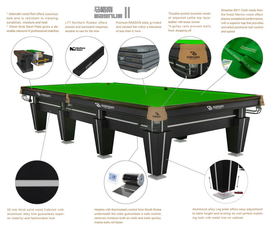 Snooker ist sehr abhängig von den Bedingungen des Spielumfelds. Besonders Feuchtigkeit kann die Spielqualität deutlich beeinträchtigen, da sich das Tuch verlangsamt und die Kugeln schwerer kontrollierbar macht. Um dem entgegenzuwirken, verfügt dieser Tisch über ein integriertes Heizsystem mit Thermostatregelung unter den Schieferplatten. Dieses sorgt dafür, dass das Tuch trocken bleibt und die Feuchtigkeit schnell von der Oberfläche sowie den Kugeln entfernt wird. Das Ergebnis: konstante Ballgeschwindigkeit und ein gleichmäßiges, vorhersehbares Rollverhalten, unabhängig von den Umgebungsbedingungen.