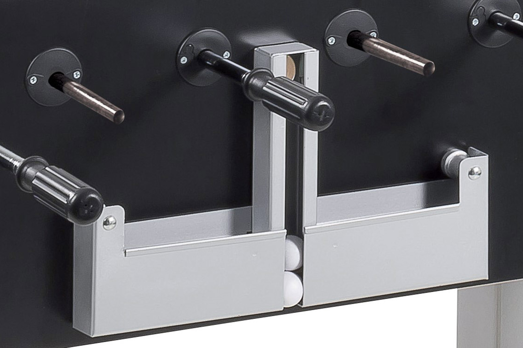 Ball control: The central ball removal is supplemented by a ball control. Thus, all foosball balls remain in the closed ball circuit - individual removal is not possible.
