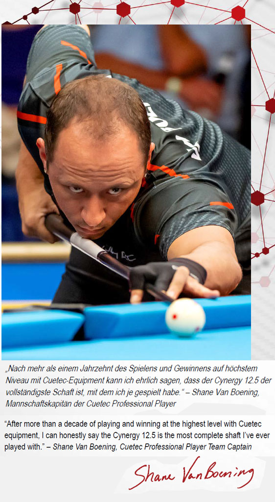 “After more than a decade of playing and winning at the highest level with Cuetec equipment, I can honestly say the Cynergy 12.5 is the most complete shaft I’ve ever played with.” – Shane Van Boening, Cuetec Professional Player Team Captain