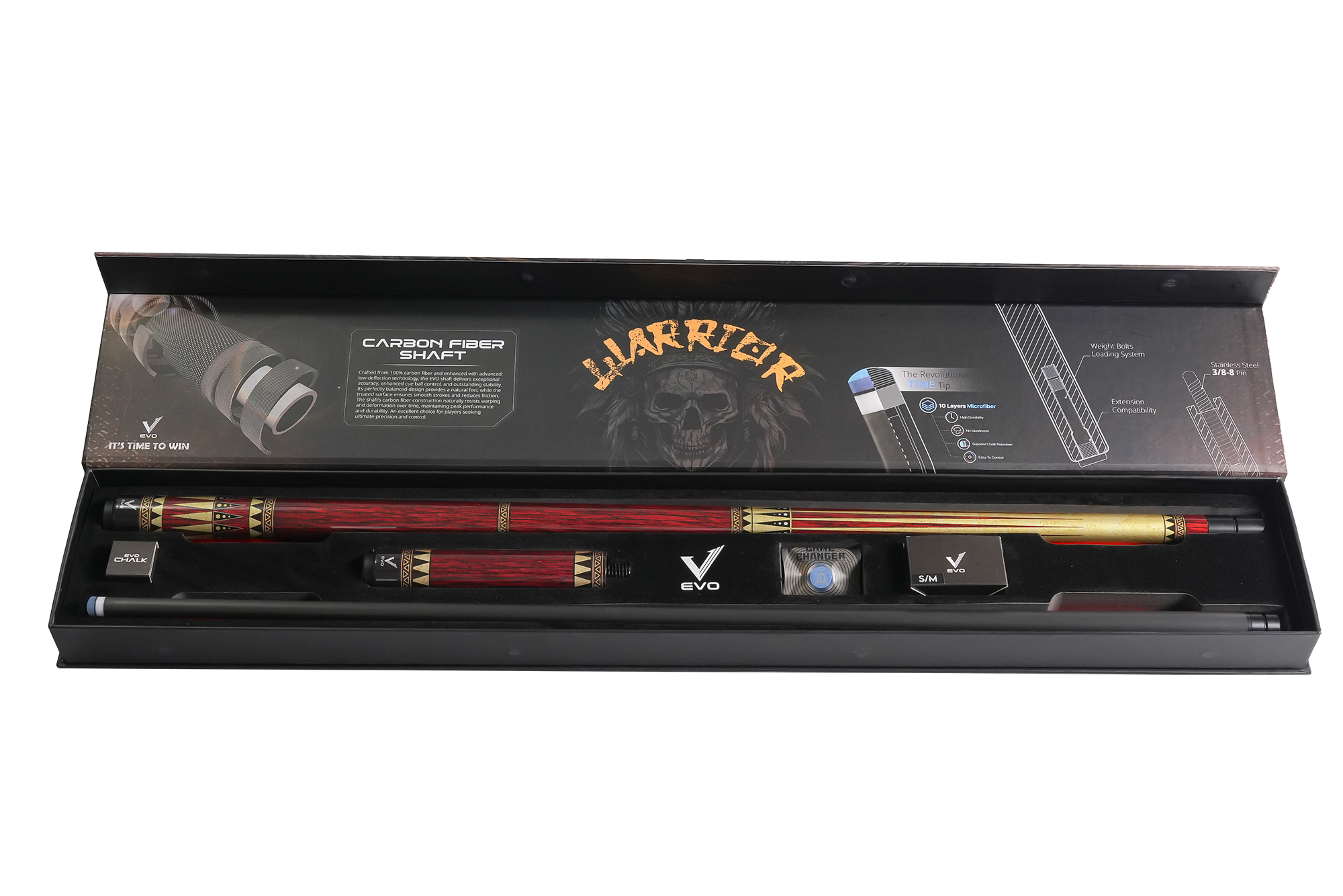 The EVO Warrior is more than just a cue – it's a statement. Its hybrid construction of carbon and fiberglass delivers maximum power with minimal deflection. Balanced, powerful, distinctive. Designed for players who accept no compromise.
