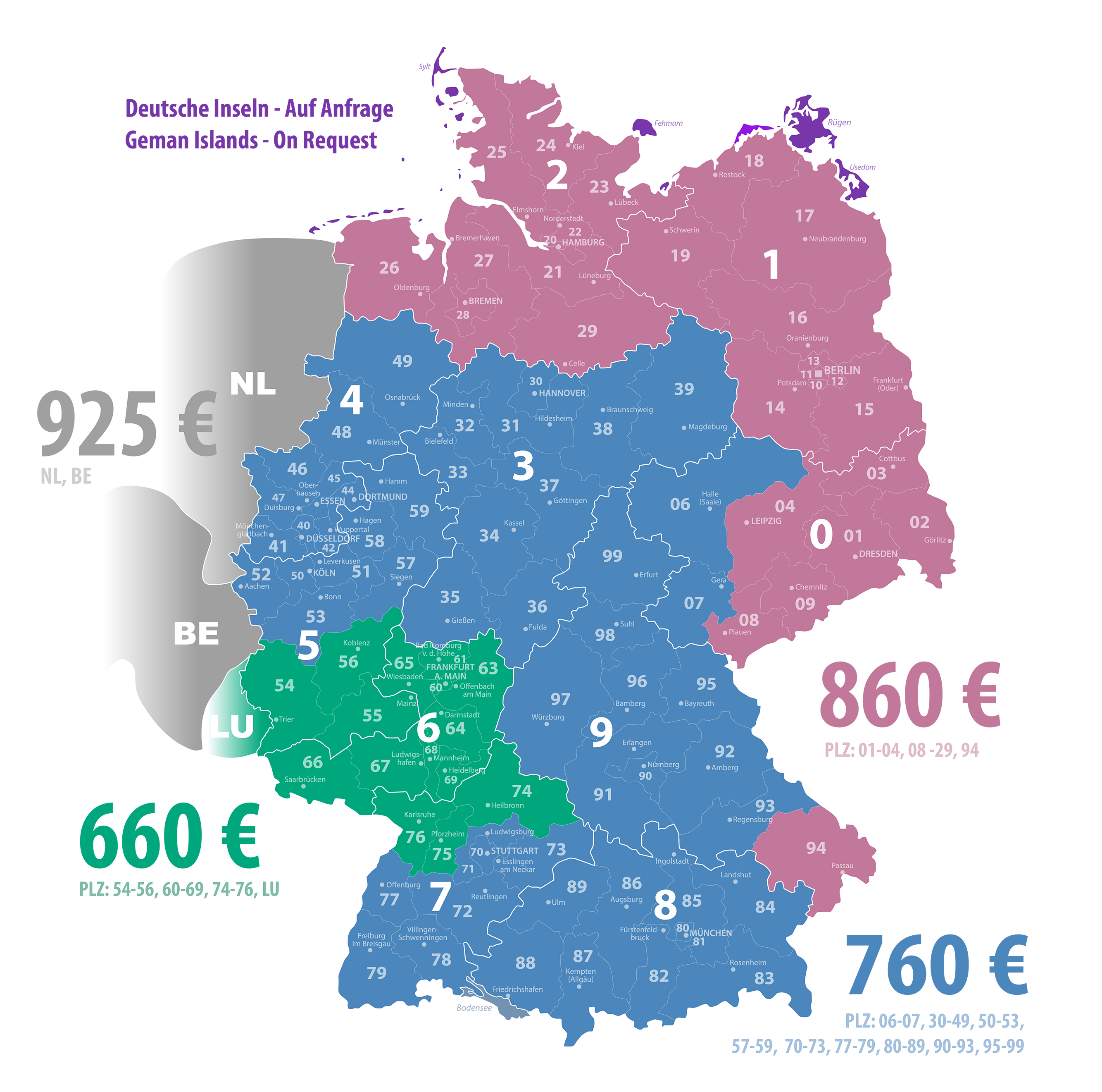 | Germany - (5 to 40 working days) 535,00 € : PLZ: 54-56, 60-69, 74-76, LU 635,00 € : PLZ: 06-07, 30-49, 50-53, 57-59, 70-73, 77-79, 80-89, 90-93, 95-99 740,00 € : PLZ: 01-04, 08 -29, 94 Delivery to islands is not always possible. Please contact us. | ab 535,00 € |